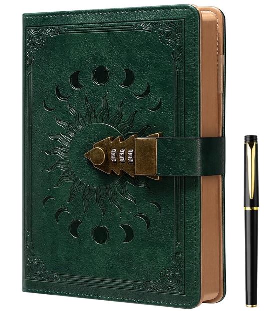Lock Journal with Pen, A5 240 Pages Diary with Lock, Brown Edge, Refillable, Leather Hardcover (8.5 × 5.9inch) Dark Green